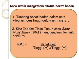. Berat kg Tinggi m x tinggi m BMI. Hasil kiraan yang anda dapat melalui formula ini. Yang penting selepas pengiraan kita patut.